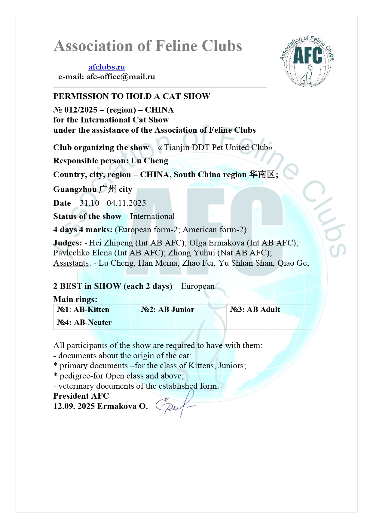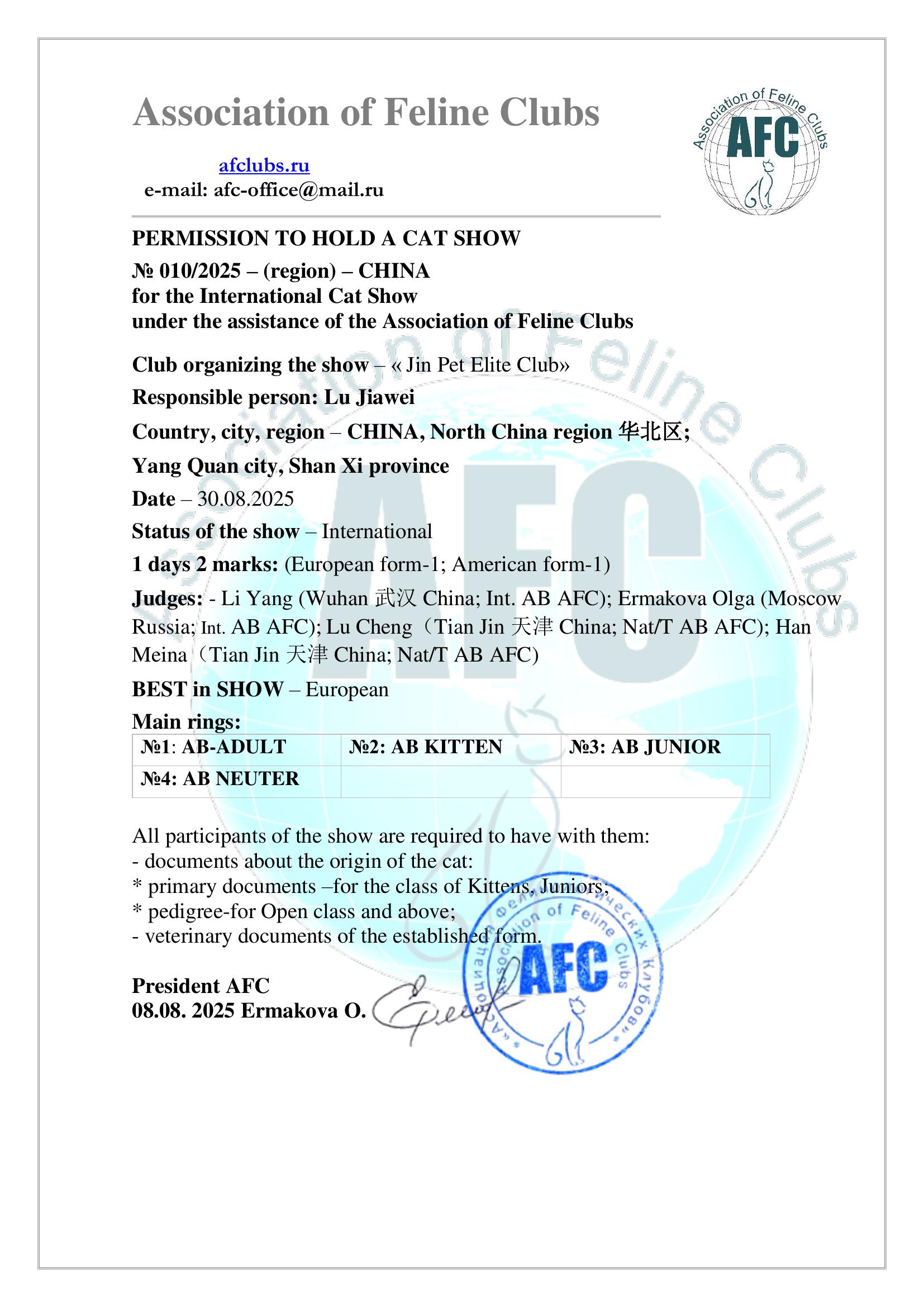 Judges: Olga Ermakova (AB AFC Moscow Russia); Zhong Yuhui (AB AFC Shenzhen China); | International BEST in SHOW – European 2 days 4 marks European form-2 American form-2 MAIN RINGS №1: AB-KITTEN №2: AB JUNIOR №3: AB ADULT №4: AB NEUTER License 006-007 |